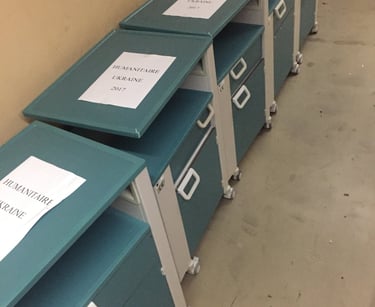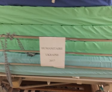 En soutien à l'Alliance Franco-Ukrainienne et au CHU de Limoges (donnateur). Lits médicalisés, ameublement pour les chambres d'hôpitaux, scopes et ECG, livres médicaux etc.