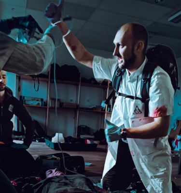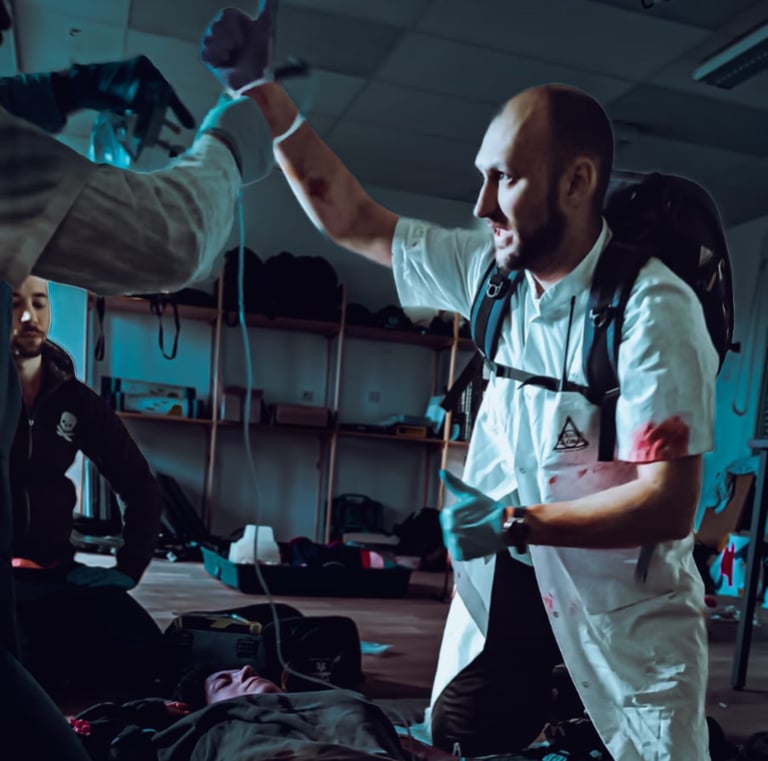 Enseignement par la simulation, en groupes de 12 élèves de tous niveaux. Ces formations sont stratégiques en santé publique pour la réduction de la morbi-mortalité pré-hospitalière par hémorragies. Parmi ces cessions,